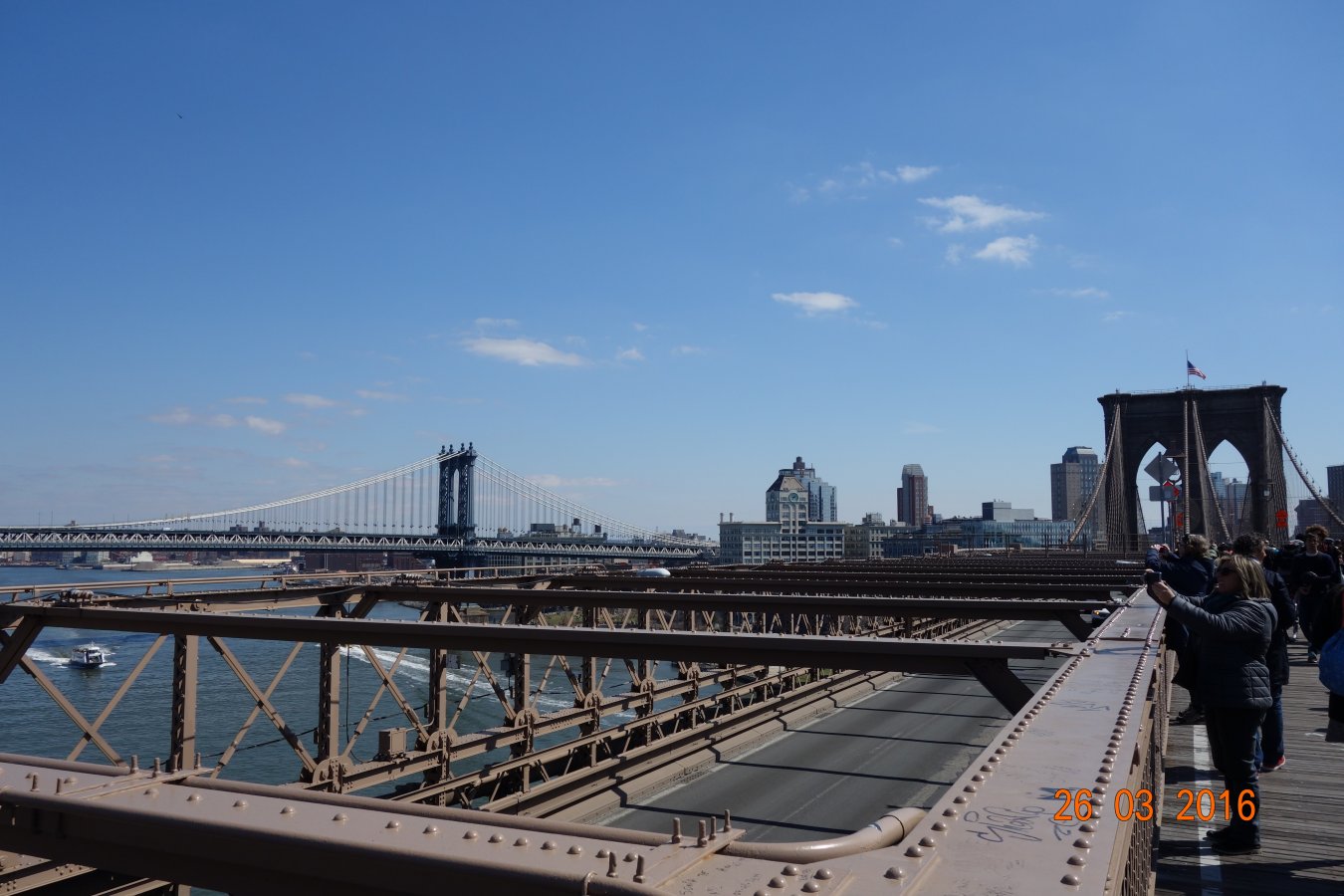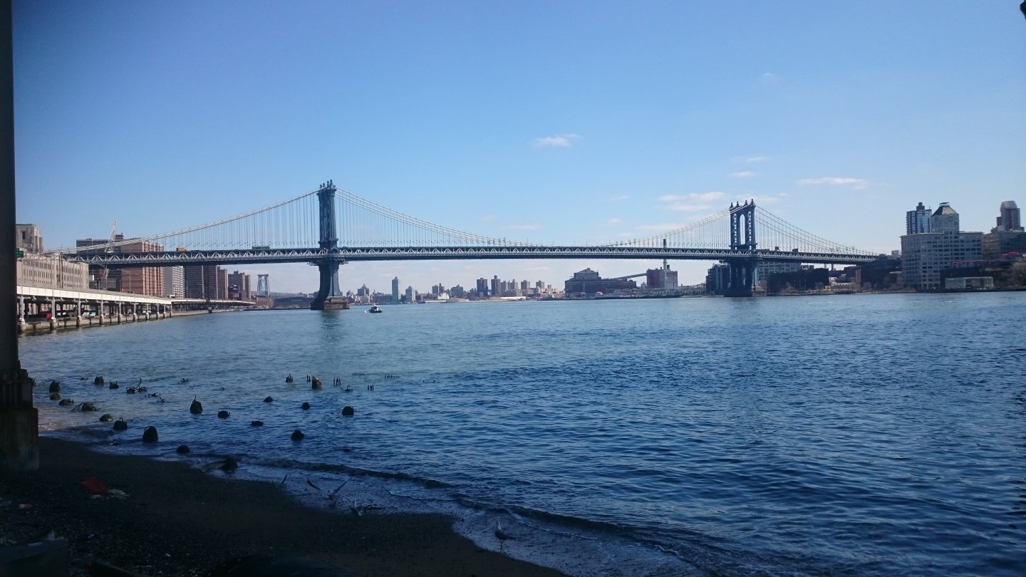 Βολτάροντας στις όχθες του ποταμού και θαυμάζοντας την ομορφιά των γεφυρών της πόλης, σκέφτομαι τη σημασία τους για την ανάπτυξη της πόλης. Η Νέα Υόρκη κάποτε ήταν μόνο το Μανχάταν. Η επέκτασή της ξεκίνησε από την ανέγερση της γέφυρας του Brooklyn. Αυτές οι γέφυρας βελτιώσαν εντυπωσιακά τη συγκοινωνία. Το μανχάταν άρχισε να φουσκώνει, να μεγαλώνει και η Νέα Υόρκη να επεκτείνται μπαίνοντας σε μία νέα εποχή. Βαδίζουμε προς το δημαρχείο για να ανεβούμε στη Brooklyn Bridge.