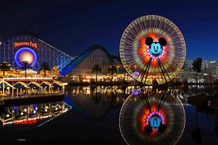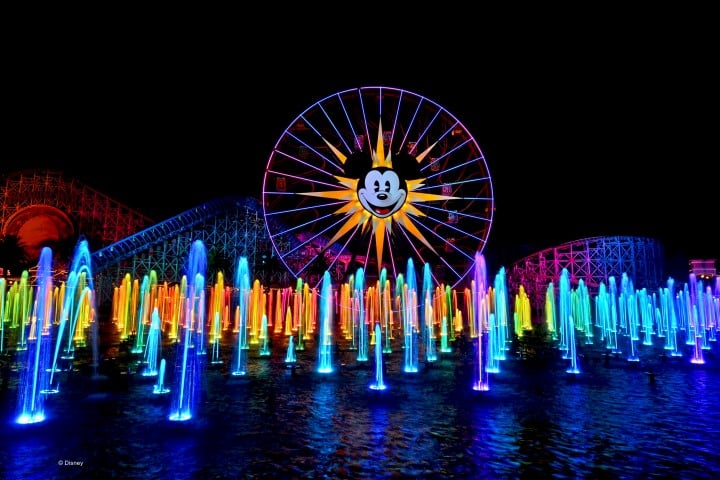 Κάθε βράδυ λίγο πριν κλείσει τις πύλες της η Disneyland προσφέρει υπερθέαμα από πυροτεχνήματα και show διαφορετικό σε κάθε πάρκο. Εδώ απολαύσαμε το “world of color” . Συντριβάνια εκτόξευαν νερό ψηλά στον αέρα σχηματίζοντας έναν τοίχο. Πάνω στον τοίχο προβάλλονταν με ζωντανά χρώματα ήρωες της disney συνοδεία αντίστοιχης μουσικής.