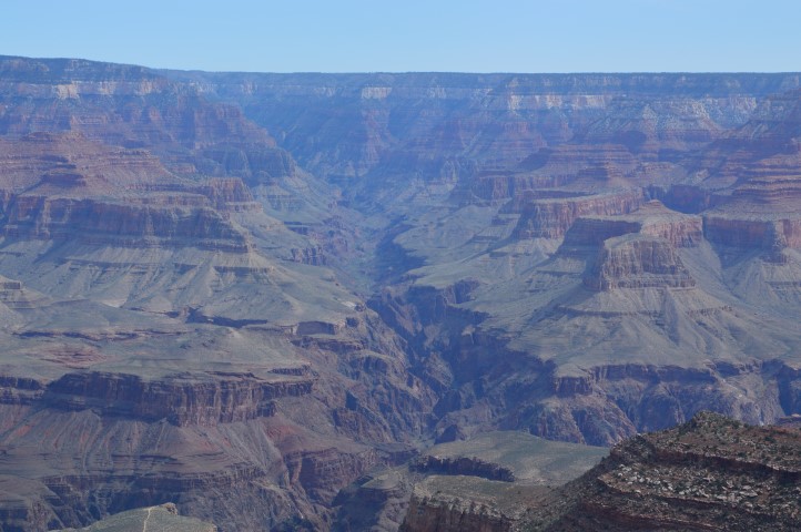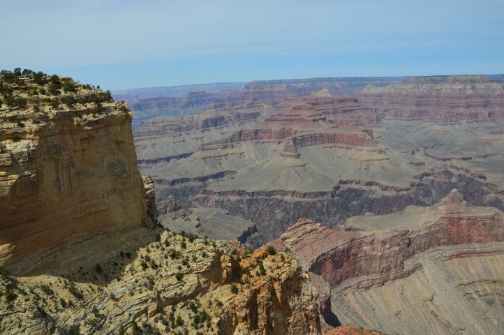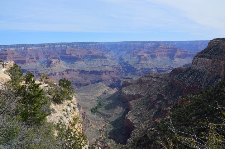 Το πρωινό ξύπνημα στο ξύλινο σπιτάκι είναι γλυκό, έχουμε φορτίσει μπαταρίες και είμαστε έτοιμοι να δούμε επιτέλους το Grand Canyon. Βγήκαμε έξω και πήγαμε προς τα εκεί που περπατούσαμε το προηγούμενο βράδυ. Πλέον η μαύρη τρύπα είχε δώσει τη θέση της σε ένα τεράστιο φαράγγι. Είναι τέτοια η μορφολογία του, που μέχρι να εξοικειωθούμε οπτικά μαζί του, αδυνατούσαμε να καταλάβουμε πού είναι η απέναντι «όχθη» Εμείς βρισκόμασταν στο south rim και ακριβώς απέναντι μας θα έπρεπε να είναι το north rim. Το «ακριβώς «απέναντι» όμως ήταν πολύ μακριά.