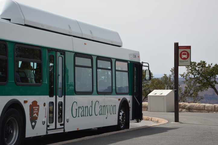 Έχοντας περπατήσει αρκετά τη διαδρομή κοντά στα δύο ξενοδοχεία του πάρκου: El Tovar και Bright Angel, αναζητάμε την αφετηρία του λεωφορείου που θα μας πάει και σε άλλα σημεία του Grand Canyon. Υπάρχει λεωφορείο που κάνει διαδρομή δέκα στάσεων σε συγκεκριμένα view points κατά μήκος του ρήγματος, το οποίο είναι δωρεάν και περνάει κάθε πέντε λεπτά. Η αφετηρία είναι σχεδόν έξω από το δωμάτιο μας! Επιβιβαζόμαστε και σε εύθυμο κλίμα ακούμε τις συστάσεις του οδηγού. Αναφέρθηκε στην πανίδα του πάρκου και αφού μας έδειξε κάτι δαρμένους και σπασμένους κορμούς δέντρων είπε πως τα προξενούν οι αρκούδες κυρίως τις βραδινές ώρες. Τα δρομολόγια τελειώνουν στη δύση του ήλιου και όποιος δεν επιβιβαστεί θα επιστρέψει με τα πόδια. Απαγορεύεται αυστηρά η κυκλοφορία οχημάτων μετά τη δύση σε αυτή την περιοχή.