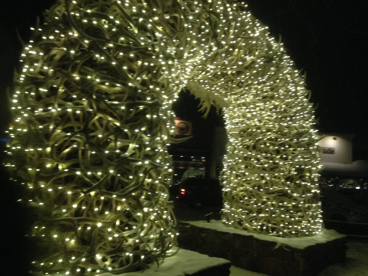 Το πρώτο μας βράδυ κάναμε μία βόλτα στο κατάλευκο Τζάκσον. Το Τζάκσον είναι μία τυπική παλιά μικρή πόλη της Αμερικής, στο πνεύμα της Άγριας Δύσης. Η πόλη έχει παντού προτομές και κρανία ζώων, καουμπόικα καπέλα και country στοιχεία. Η κεντρική πλατεία της πόλης είναι διάσημη για τις τέσσερις πύλες που έχουν κατασκευαστεί εξολοκλήρου από κέρατα των elks (εντυπωσιακό ελαφοειδές). Τα elks ρίχνουν τα κέρατά τους στα δάση της τριγύρω περιοχής. Από τα κέρατα αυτά κατασκευάζονται διάφορα αντικείμενα, κυρίως έργα τέχνης που πωλούνται στις δεκάδες γκαλερί της πόλης.