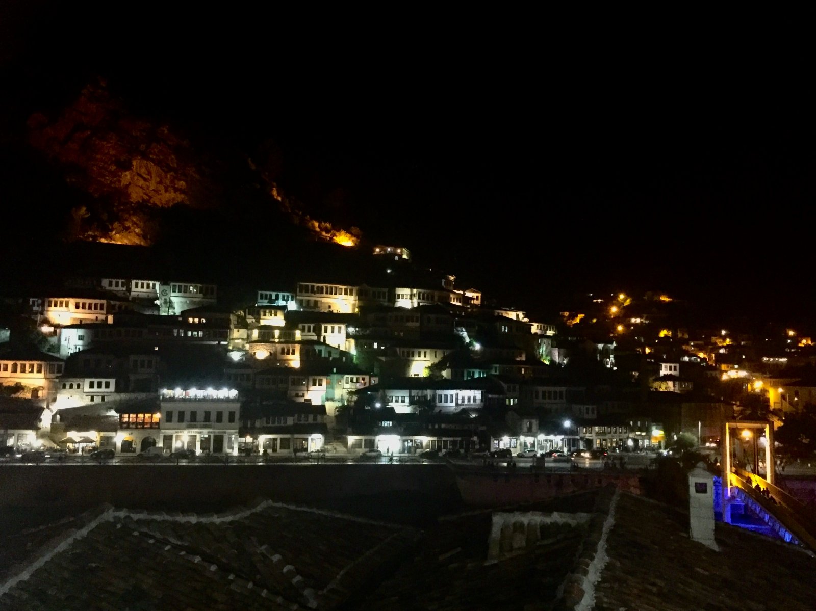 Berat by night από το μπαλκονάκι του εστιατορίου Αντιγόνη.