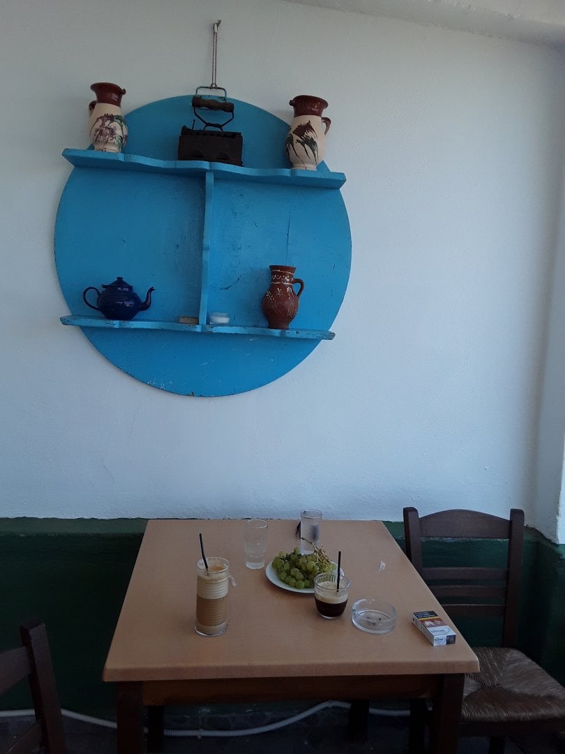 Στον τοίχο κρέμεται ο λεγόμενος σοφράς. Είναι χαμηλό τραπέζι που έτρωγαν ή έπλαθαν πάνω σ' αυτό καθισμένοι στο πάτωμα. Άβαφο ήταν. Καλή ιδέα να το αξιοποιείς ως ραφιέρα, να μην πιάνει χώρο.Σπόα, Κάρπαθος. Παραδοσιάκα, λιτά κι απέριττα. Και σταφυλάκι κέρασμα.