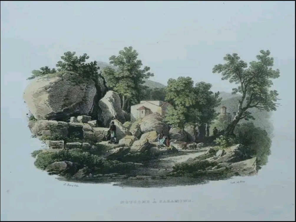 Xωριὸ Μουλκίου, 1811, χαρακτικο του βαρώνου Otto Magnus von Stackelberg. Η εκκλησία (17ου αιωνος) του Αγίου Ιωάννου του Νηστευτου (Νηστικού) καὶ στὸ βάθος η εκκλησία της Μεταμορφώσεως του Σωτηρος, του 12ου αιωνος.