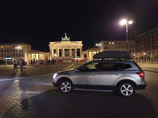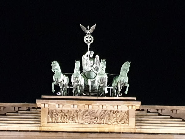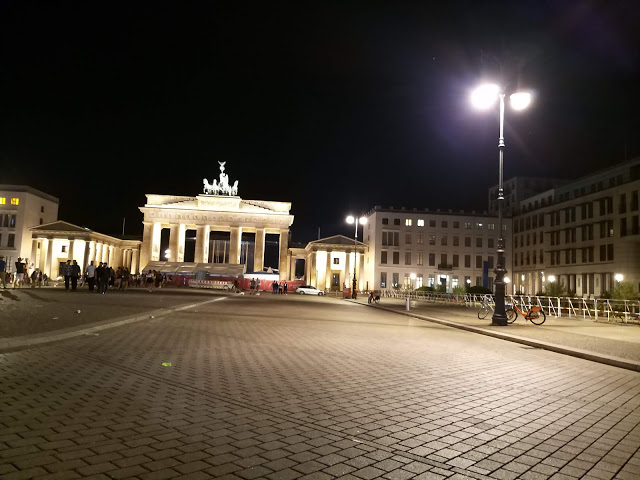 Αφού τα είδαμε όλα αυτά αργά πια το βράδυ περάσαμε με το αυτοκίνητο και παρκάραμε ακριβώς μπροστά από τη Πύλη του Βρανδεμβούργου(Brandenburger Tor).Είναι πολύ όμορφα φωταγογημένη, ιδιαίτερα εντυπωσιακή , δεν έχει πολύ κόσμο και έτσι δεν χάσαμε την ευκαιρία να τη φωτογραφίσουμε.