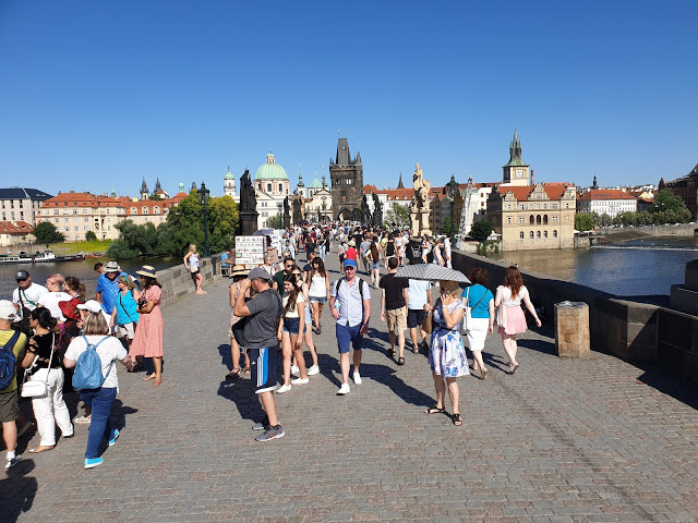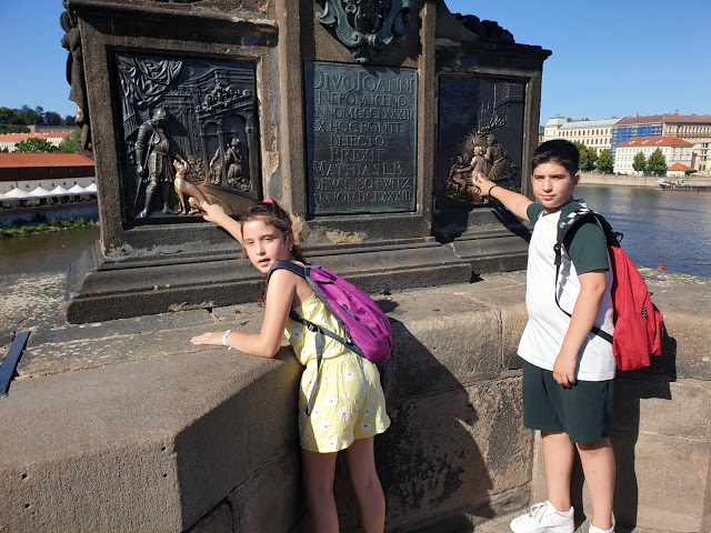 Ξεκινήσαμε οπότε τη βόλτα μας από την είσοδο της Mala Strana και μετρώντας το 8ο άγαλμα από την αριστερή πλευρά βρεθήκαμε στο άγαλμα του Αγ.Ιωάννη Νεπομούκ του πιο αγαπητού Αγίου στη Βοημία,ο οποίος πνίγηκε στον ποταμό Μολδάβα.Ακουμπήσαμε το χέρι μας στις ανάγλυφες πλάκες στις βάσεις γιατί έτσι λέγεται θα έχουμε τύχη.Λίγο πιο κάτω από την ίδια πλευρά υπάρχει ένα μαύρο κάγκελο με 5 χρυσά αστέρια και ένα ανάγλυφο του Αγ. Ιωάννη να πνίγεται.Αν ακουμπήσεις το κάθε αστέρι ξεχωριστά ,βάλεις το χέρι σου στο σταυρό και κάνεις μια ευχή τότε αυτή θα πραγματοποιηθεί.