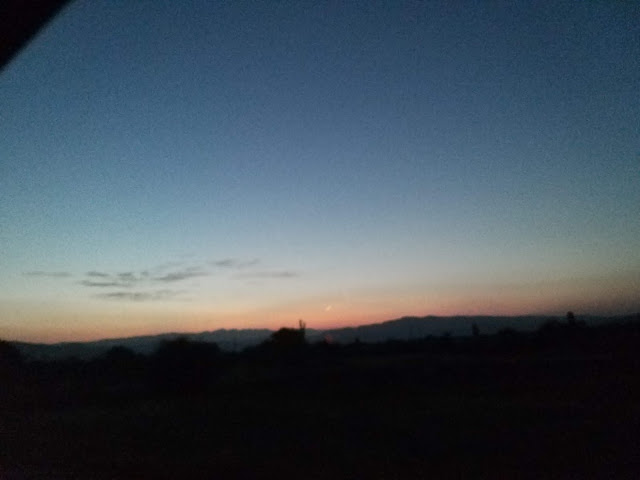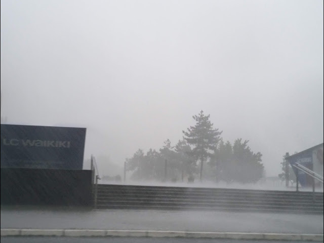 Μέχρι το μεσημέρι έχει πολύ καλό καιρό με πολύ ζέστη.Ξαφνικά ξεκινάει μια δυνατή μπόρα(ευτυχώς προλάβαμε να πάμε στο αυτοκίνητο),όλα σκοτείνιασαν, ,πολύ ομίχλη και οι δρόμοι στο λεπτό έγιναν ποτάμια.Δεν βλέπουμε στο μισό μέτρο,κινούμαστε με alarm.Πρωτοφανές τουλάχιστον για εμάς .