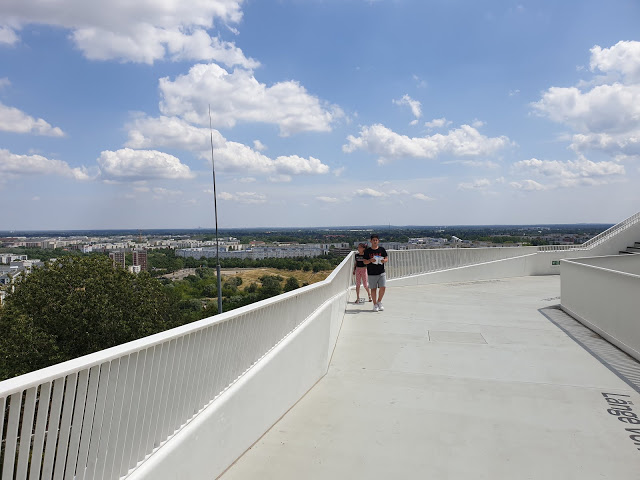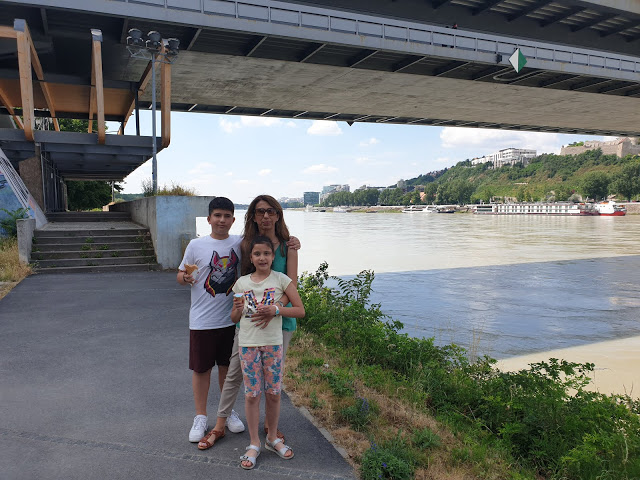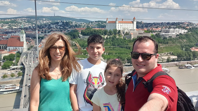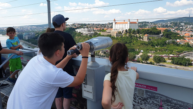 Ανεβήκαμε λοιπόν στο UFO με ασανσέρ πληρώνοντας είσοδο 20 ευρώ,οικογενειακό εισιτήριο τεσσάρων ατόμων.Το UFO έχει ύψος 90 μέτρα οπότε έχει μια πανοραμική θέα της πόλης και από τις δύο πλευρές της και στα πόδια σου τον Δούναβη.