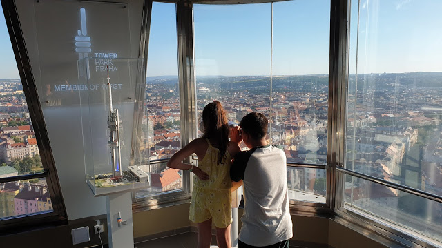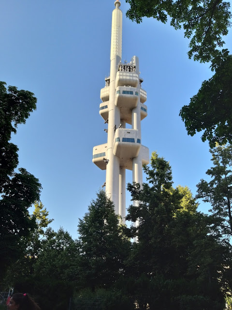 Συνεχίζουμε τις βόλτες μας στην παλιά πόλη , και μετά με το αυτοκίνητο επισκεφτήκαμε τον πύργο της τηλεόρασης που βρίσκεται λίγο έξω από το κέντρο, σε μια ήσυχη περιοχή μέσα σε ένα καταπράσινο πάρκο.Ο πύργος έχει ύψος 216 μ. και μέσα υπάρχει ένα καφέ- εστιατόριο καθώς και το παρατηρητήριο σε ύψος 93μ.όπου η θέα της πόλης είναι μοναδική,καθώς μπορείς άνετα να δεις την Πράγα απ΄όλες τις πλευρές.Εξωτερικά είναι διακοσμημένος με τα γιγάντια γλυπτά μωρά που είδαμε και στο πάρκο του νησιού Κάμπα. Ανεβήκαμε στον πύργο με ασανσέρ και με είσοδο 25 ευρω(οικογενειακό) μόνο και μόνο να θαυμάσουμε τη θέα.