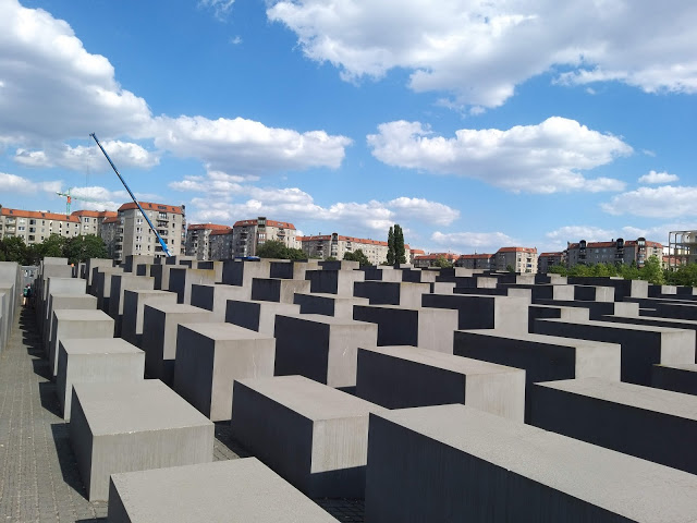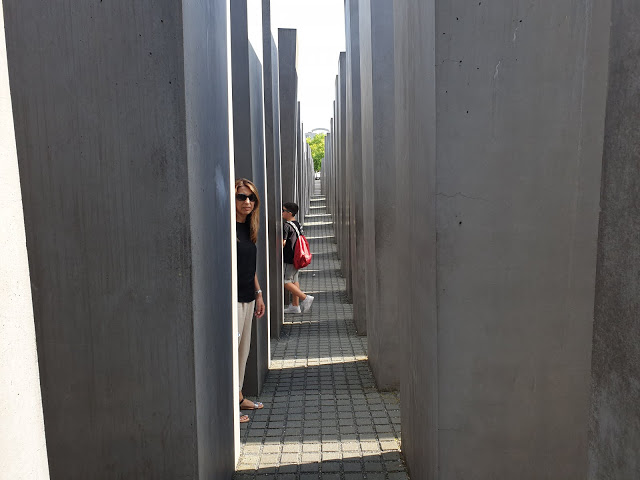 Προχωρώντας φτάσαμε και στο Μνημείο του Ολοκαυτώματος.Το διάσημο αυτό μνημείο είναι σχετικά καινούργιο αφού δημιουργήθηκε το 2003 και είναι αφιερωμένο στους εκατομμύρια Εβραίους της Γερμανίας και της υπόλοιπης Ευρώπης που εξοντώθηκαν από τους ναζί.2711 γκρι,τεράστιοι,πέτρινοι,παραλληλόγραμμη,ανισομεγέθεις όγκοι,τοποθετημένοι ο ένας δίπλα στον άλλο,με τέτοιο τρόπο ώστε να δημιουργούν διαδρόμους που μπορείς να περιπλανηθείς ανάμεσά τους από οποιαδήποτε σημείο του μνημείου.Σου θυμίζει λαβύρινθο,αλλά και νεκροταφείο,χωρίς όμως επιγραφές με ονόματα και ημερομηνίες.Ο χώρος που απλώνονται είναι τεράστιος και σου δημιοργεί μια μελαγχολία.