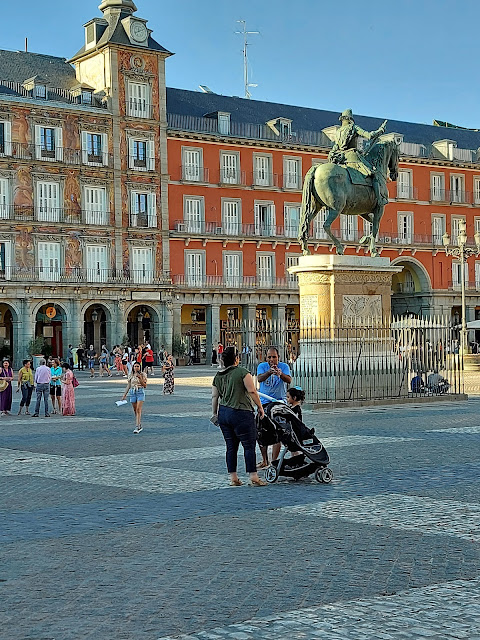 Αργά το απόγευμα πάμε με το αυτοκίνητο στο κέντρο της πόλης.Αφού περιπλανηθήκαμε αρκετά βρήκαμε τελικά πάρκινγκ κοντά στο κέντρο.Περπατώντας σε στενά δρομάκια αλλά και λεωφόρους φτάσαμε στη κεντρική πλατεία της πόλης στη Plaza Mayor. Η Πλάθα Μαγιόρ(Plaza Mayor) είναι μια ιστορική και πανέμορφη πλατεία. Περιβάλλεται από ομοιόμορφα κτίρια και αμέτρητα μπαλκόνια και στα ισόγεια των κτιρίων βρίσκονται εστιατόρια και καφετέριες γεμάτα με τουρίστες.Στο κέντρο βρίσκεται το άγαλμα του Φιλίππου Γ’.