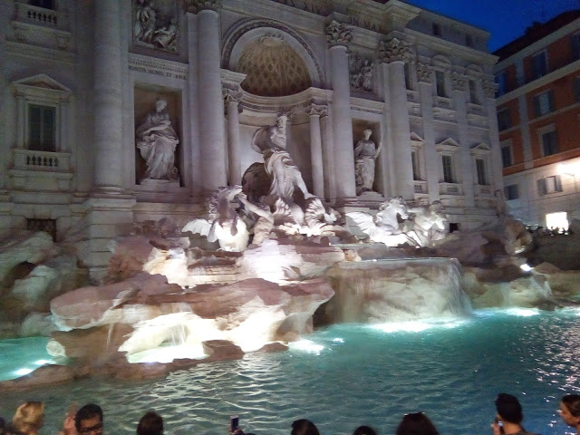 Η Φοντάνα ντι Τρέβι είναι το πιο διάσημο και το πιο όμορφο συντριβάνι της Ρώμης .Η κεντρική φιγούρα του συντριβανιού είναι ο Ποσειδώνας ,θεός της θάλασσας.Η αναπαράσταση έχει τον Ποσειδώνα στα ηνία ενός άρματος σε σχήμα κελύφους ,να έλκεται από δύο ιππόκαμπους .Κάθε ιππόκαμπος καθοδηγείται απο ένα Τρίτωνα. Ένα από τα άλογα είναι ήρεμο και υπάκουο,και το άλλο ανήσυχο.Οι συμπεριφορές τους συμβολίζουν τις διακυμάνσεις της θάλασσας.Απο την αριστερή πλευρά του Ποσειδώνα είναι ένα άγαλμα που εκπροσωπεί τη αφθονία ,και στα δεξιά ένα άγαλμα που αντιπροσωπεύει την υγιεινή.Το νερό στο κάτω μέρος του συντριβανιού αντιπροσωπεύει τη θάλασσα.Ο θρύλος λέει ότι θα επιστρέψετε στη Ρώμη εάν πετάξετε μέσα ένα κέρμα στο νερό.Θα πρέπει να το πετάξετε πάνω απο τον ώμο με την πλάτη προς το νερό.Πράγμα που κάναμε και μεις αλλά κάνοντας μια ευχή.Βέβαια για να καταφέρεις να ρίξεις το κ΄ρμα πρέπει να στριμωχτείς και να κάνεις γρήγορα γιατί έχει πολύ κόσμο που θέλει να κάνει το ίδιο πράγμα και να βγάλει φωτογραφίες.