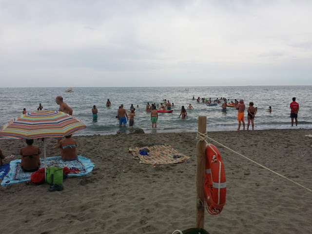 Ημέρα ξεκούρασης.Ξυπνήσαμε αργά ,πήραμε το πρωινό μας και χαλαρά ξεκινήσαμε για μπάνιο σε κοντινή παραλία.Μετά απο 35 χλμ φτάσαμε σε ένα πολύ τουριστικό μέρος με πολύ κόσμο.Παρκάραμε σ΄ένα από τα πολλά μαγαζιά που ήταν πάνω στη θάλασσα που είχε και την Ελληνική σημαία.Φτάνουμε στην πλαζ και παντού είχε τεράστιες ομπρέλες με κρεβάτια -ξαπλώστρες ,τραπεζάκια κτλ.,όλα πολύ οργανωμένα.Ρωτήσαμε για να καθίσουμε και μας είπαν ότι κοστίζει 135 ευρώ τη μέρα.Εννοείται φύγαμε.Προχωρήσαμε και στο τέλος της παραλίας βρήκαμε άλλα μαγαζιά με κανονικές, για μας .ξαπλώστρες και ομπρέλες ,αλλά και ελεύθερη ζώνη για να απλώσεις την πετσέτα σου δωρεάν.Προτιμήσαμε αυτό γιατί ήταν μια μέρα με σύννεφα και δεν είχαμε και πολύ χρόνο.Ωραία θάλασσα χωρίς κάτι το ιδιαίτερο.