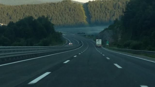 Περάσαμε τα ελληνικά σύνορα πολύ γρήγορα και στα σύνορα των Σκοπίων είχε μια μικρή ουρά αλλά μόνο με τον τυπικό έλεγχο των διαβατηρίων προχωρήσαμε.και 6:50 π.μ. μπήκαμε στα Σκόπια.Τα φώτα όλοι αναμμένα, πάμε αργά και σταθερά.Πρώτο γέμισμα βενζίνης ,βάλαμε 48 λίτρα και πληρώσαμε 57 €,(εννοείται δέχονται €).Περνάμε και τα πρώτα διόδια αξίας 1,5 € αλλά εδώ δέχονται μόνο κέρματα του 1 και 2 € καθώς και των 50 λεπτών.Διασχίζοντας τη χώρα πληρώσαμε άλλες 4 φορές του 1 και 1,5 €.