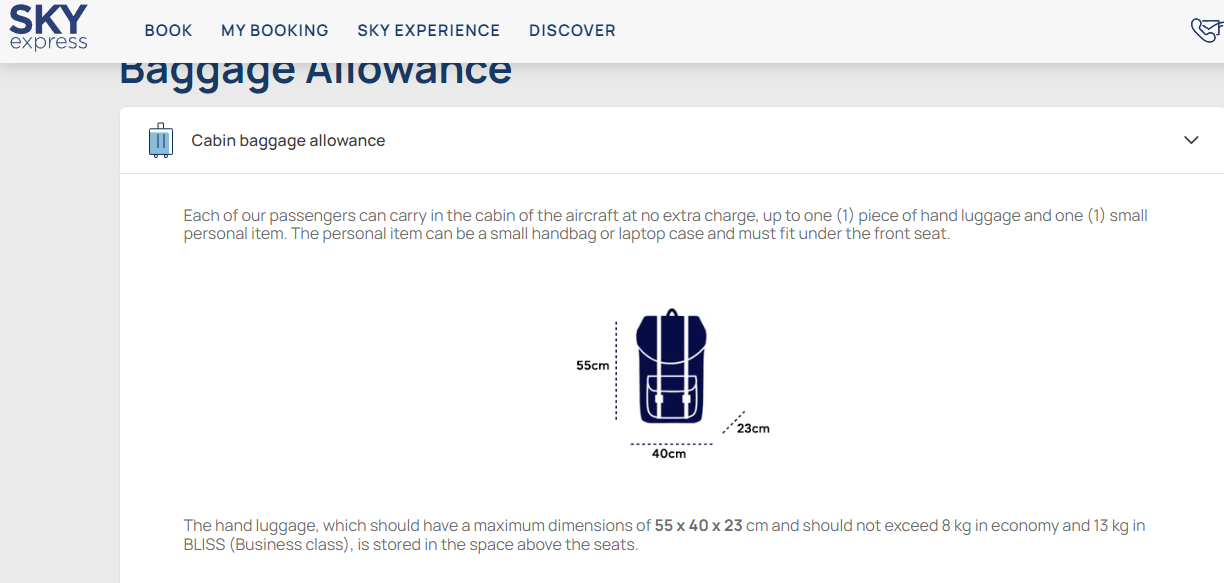 Από το επίσημο site της εταιρίας, στο οποίο και πρέπει να βασιστείς:Παιδια θα ταξιδεψω στο λονδινο με sky express και αυτο που δεν βρισκω με τιποτα ειναι οι διαστασεις της τσαντας καμπινας που παει κατω απο το καθισμα οπως λενε.Επισης για τη χειραποσκευη το site της εταιριας δινει 50χ40χ23 ενω σε αλλα site ακομα και εδω βρισκω αλλες διαστασεις.Ξερει καποιος να με βοηθησει?