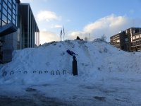 Βγαίνοντας έξω δεν ένιωσα πολύ κρύο, περίμενα ότι θα ήταν χειρότερα. Είχε συννεφιά και η θερμοκρασία ήταν κάπου στους 3 βαθμούς οπότε ένιωθα μια ευχάριστη, αναζωογονητική δροσιά. Εξάλλου μου αρέσει το κρύο, καλό ντύσιμο σε στυλ κρεμμυδιού και όλα καλά! Το πρώτο πράγμα στο οποίο εστίασαν τα μάτια μου ήταν το χιόνι. Μιλάμε για πολύ χιόνι! Οι δρόμοι και τα πεζοδρόμια ήταν καθαρά αλλά τριγύρω τους υπήρχαν τεράστιες στοίβες χιονιού. Κι όταν λέω τεράστιες, κάποιες φορές έφταναν και τα 3-4 μέτρα. Ήταν χιόνι μηνών που είχε μαζευτεί στην άκρη από τα μηχανήματα και περιμένει τον ερχομό του καλοκαιριού για να λιώσει (κάπου τον Ιούνιο καθαρίζει τελείως το τοπίο). Αυτό μάλιστα που ήταν συσσωρευμένο πάνω στις στέγες, αποδείχτηκε αρκετά επικίνδυνο. Μπορούσε να πέσει ανά πάσα στιγμή στο κεφάλι των περαστικών, γι' αυτό και υπήρχαν απαγορευτικές κορδέλες στα πεζοδρόμια σε κάποια σημεία, ώστε να κάνεις παράκαμψη. Μια μέρα, γλίτωσα κυριολεκτικά παρά τρίχα, μια “χιονοστιβάδα” έπεσε ξυστά από πίσω μου!! Έκανε τόσο θόρυβο που μέχρι και οι πεζοί από απέναντι σταμάτησαν κι έψαχναν να δουν τι έγινε! Φτηνά τη γλίτωσα.
