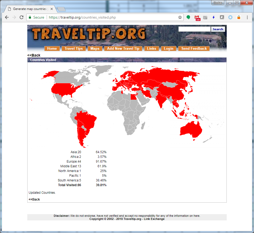 https://traveltip.org/countries_visited.phptaver τωρα πηρα χαμπαρι οτι το τραβμπαντυ μας αφησε χρονους. ψαχνοντας νεο χαρτη μετα απο εκτενη αναζητηση (δηλ ειδα το δικο σου) εχω μια ερωτηση: γιατι οι χωρες εμφανιζονται με διαφορετικες αποχρωσεις? υπαρχει καποια επιλογη να μην γινεται αυτο? αλλιως βρες μας αλλον συντομα..