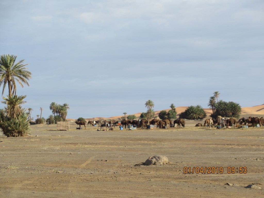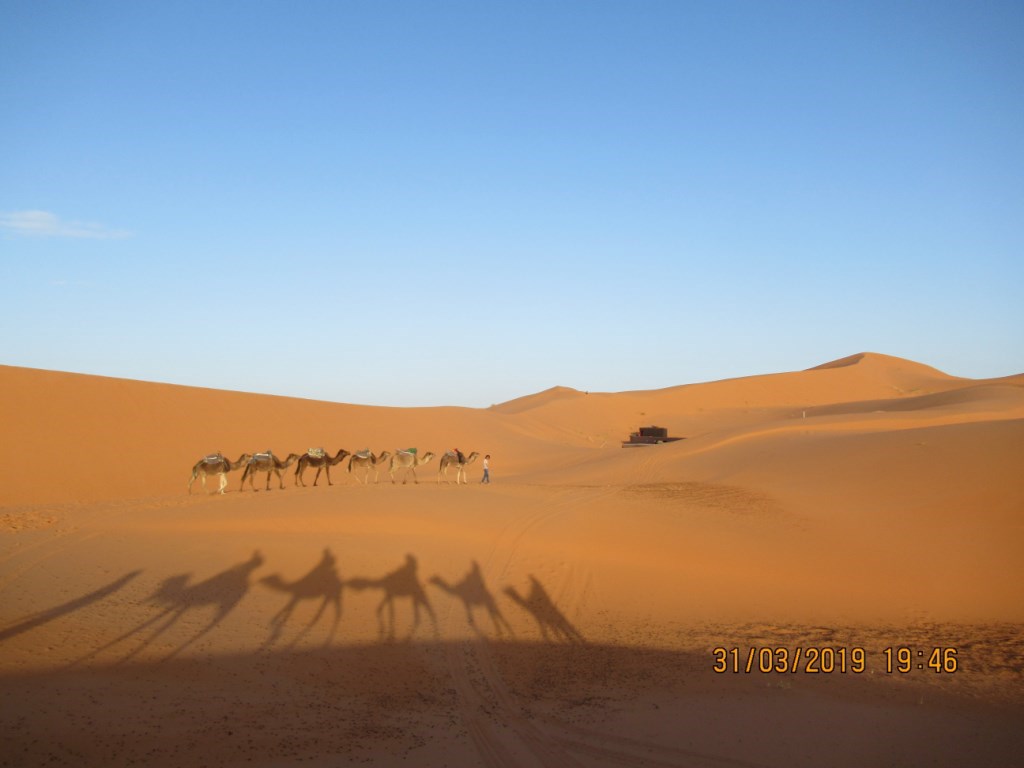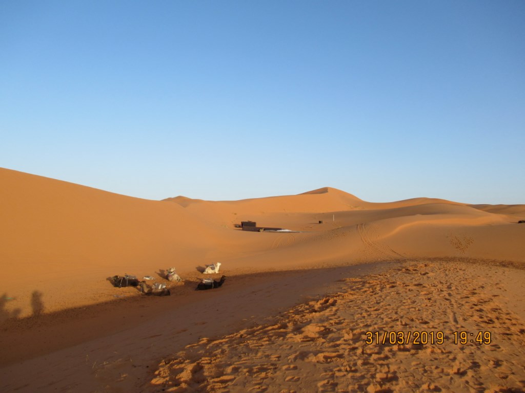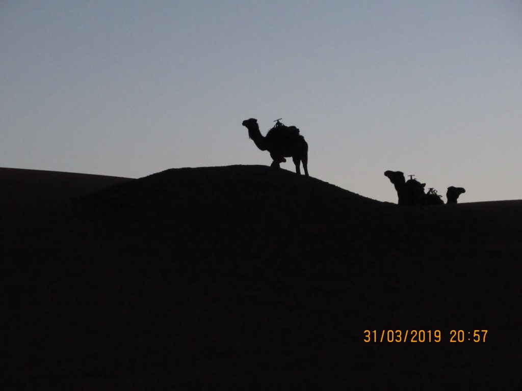 Μερζούγκα η πόλη της ερήμου. Κατασκευές ταιριαστές με το περιβάλλον, και μερικά μεγάλα ξενοδοχεία κρύβονταν πίσω από την πυκνή δενδροστοιχία φοινίκων. Το δικό μας απλό για τις ανάγκες των καμηλιέρηδων δηλαδή για μας, βρισκόταν κοντά στο σταθμό των καμήλων οι οποίες καθισμένες στα γόνατα περίμεναν τους πελάτες... Τοποθετήσαμε τις αποσκευές μας στο ξενοδοχείο πήραμε μαζί μας ένα μπογαλάκι με τα απαραίτητα για τη διανυκτέρευση στην κατασκήνωση και το σπουδαιότερο 12ώρο τους ταξιδιού μας στο Μαρόκο ξεκίνησε