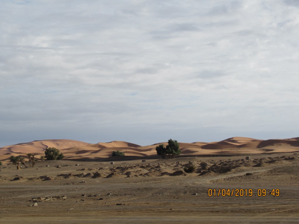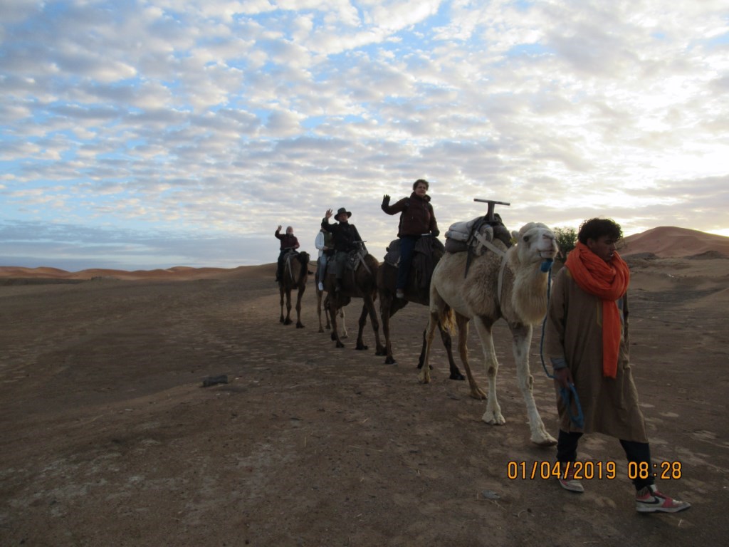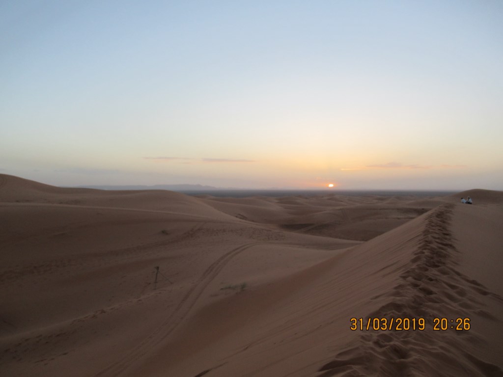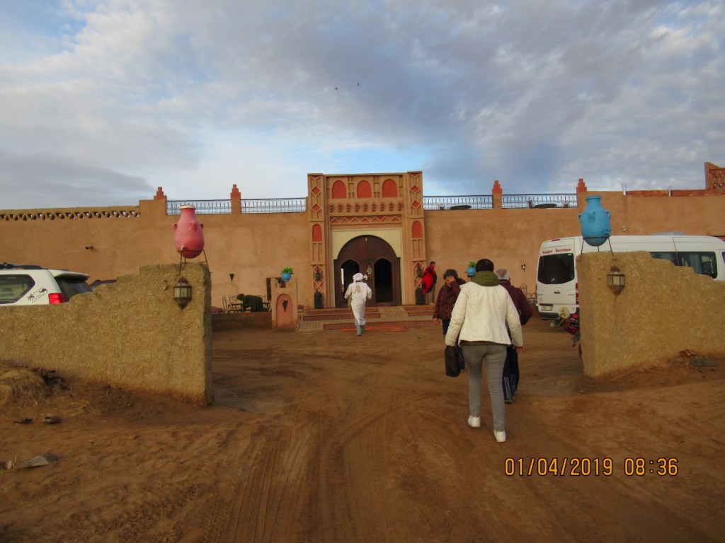 Μερζούγκα η πόλη της ερήμου. Κατασκευές ταιριαστές με το περιβάλλον, και μερικά μεγάλα ξενοδοχεία κρύβονταν πίσω από την πυκνή δενδροστοιχία φοινίκων. Το δικό μας απλό για τις ανάγκες των καμηλιέρηδων δηλαδή για μας, βρισκόταν κοντά στο σταθμό των καμήλων οι οποίες καθισμένες στα γόνατα περίμεναν τους πελάτες... Τοποθετήσαμε τις αποσκευές μας στο ξενοδοχείο πήραμε μαζί μας ένα μπογαλάκι με τα απαραίτητα για τη διανυκτέρευση στην κατασκήνωση και το σπουδαιότερο 12ώρο τους ταξιδιού μας στο Μαρόκο ξεκίνησε