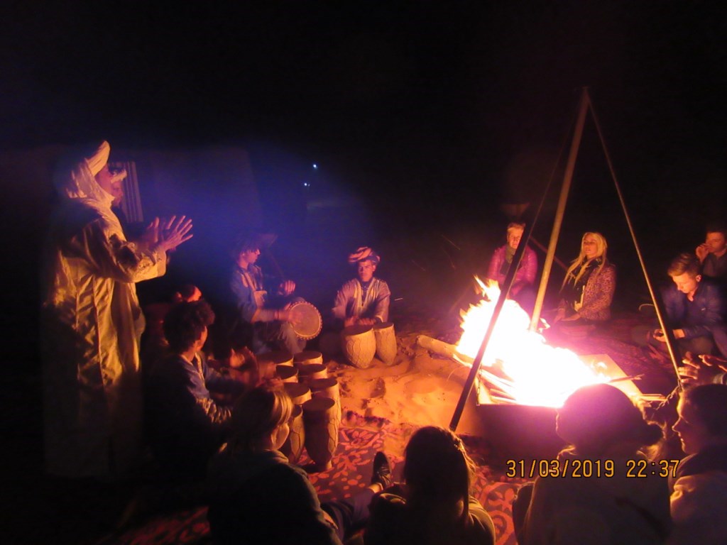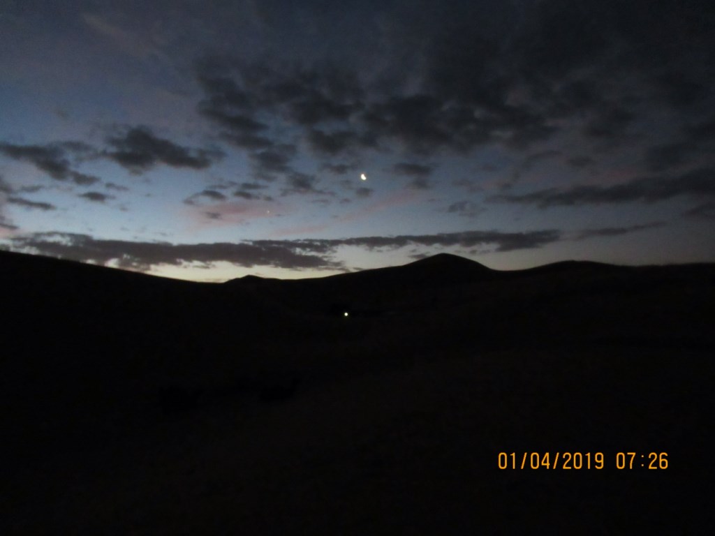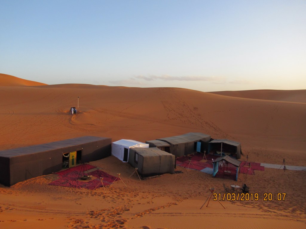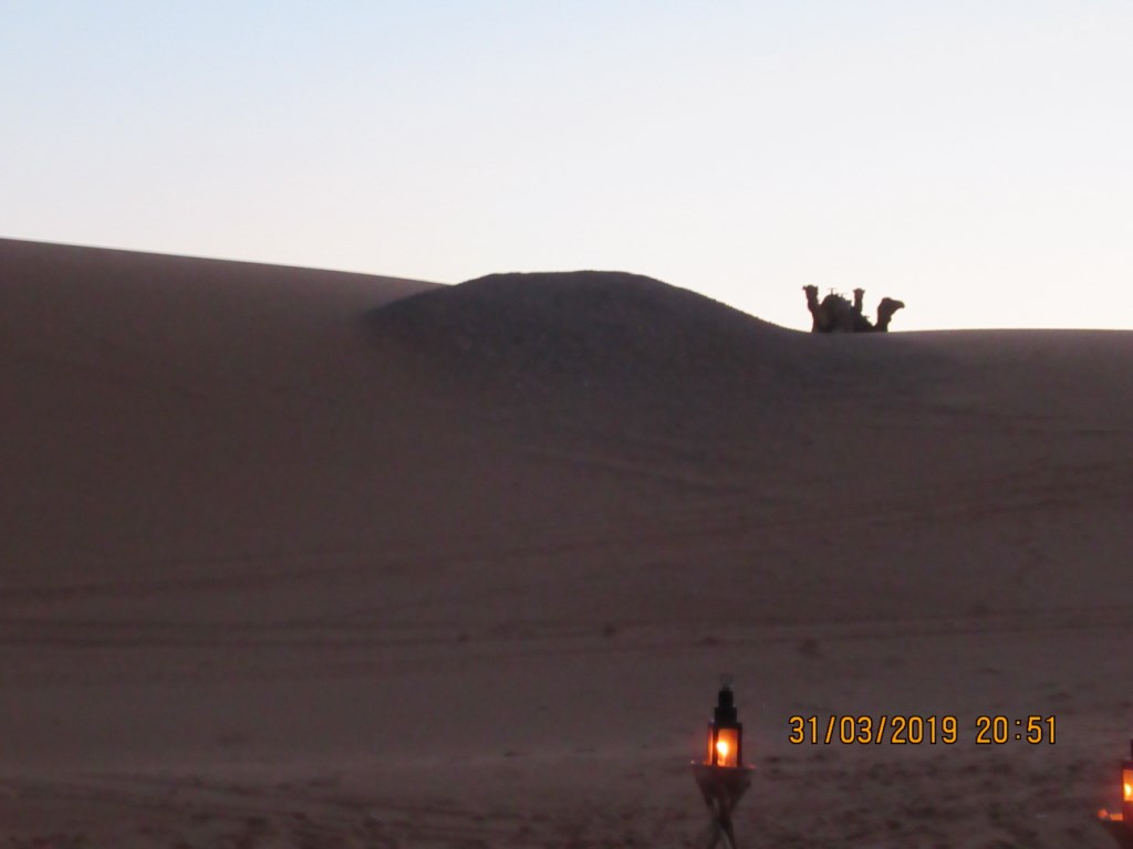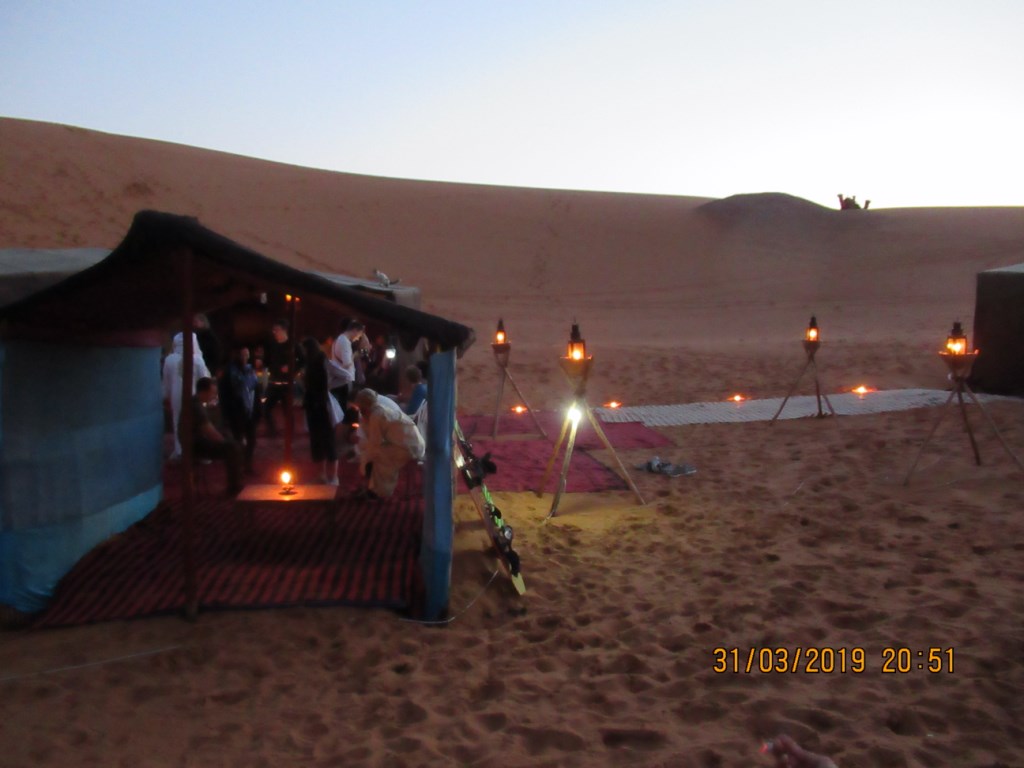 Μετά από μια ώρα ταξίδι φάνηκες ο καταυλισμός μας σ ένα χώρο επίπεδο περικυκλωμένο από ψηλούς αμμόλοφους. Ξεπεζέψατε από τις καμήλες σε κάποια απόσταση απ αυτόν και συνεχίσαμε με τα πόδια. Κατάμαυρες οι σκηνές, γύρω της δάδες καρφωμένες στην άμμο, κάποια χαλάκια στο χώρο της υποδοχής και έαν κέρασμα με αρωματικό τσάι. Σκαρφαλώσαμε μετά δυσκολίας σε μια κορυφή, καθίσαμε πάνω στην καθαρή άμμο περιμένοντας το ηλιοβασίλεμα που δεν άργησε. Όταν σκοτείνιασε ακολούθησε το δείπνο σε μια κλειστή τεράστια τραπεζαρία, μαζί μας ήταν άλλα οκτώ άτομα ταξιδιωτών, και κατόπιν παρακολουθήσαμε ένα πρόγραμμα βερβέρικης μουσικής και χορών γύρω από τη φωτιά.