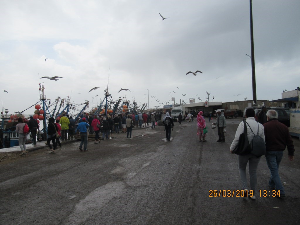 Δεν υπάρχει πιο δυσάρεστη κατάσταση από το να φτάσεις σε μια άγνωστη πόλη να είναι νύχτα και κακώς φωτισμένη. Ήταν αδύνατο να εντοπίσουμε το λιμάνι και τα εστιατόρια κάθε είδους ήταν κλειστά. Σε μια γωνιά ένας γεροντάκος έψηνε βάφλες και καταλήξαμε θεονήστικοι όλη μέρα, να τη βγάλουμε με βάφλες κάτι που δεν έχω κάνει ποτέ στην Ελλάδα, και ντόπιο τσάι. Που; στην Εσσαουίρα… Στην επιστροφή προς το ξενοδοχείο ένα φωτισμένο σημείο που φαινόταν από μακριά ήταν ο μοναδικός πάγκος που διανυχτέρευε με ψάρια απ όλα τα είδη. Όμως ήταν αργά για μας κείνη την ώρα. Το επόμενη μέρα πήραμε ξανά τα ίδια μονοπάτια περάσαμε από το πρακτορείο των λεωφορείων και βγάλαμε τα εισιτήρια για το Μαρακές για τις 5 το απόγευμα, εντοπίσαμε το λιμάνι με τα καΐκια που ξεφόρτωνα τις ψαριές του, παρακολουθήσαμε ένα μοναδικό σόου με τους γλάρους να κλέβουν τις σαρδέλες από τους πάγκους των μικροπωλητών βουτήξαμε σε λασπόνερα, είδαμε ξανά τις παράγκες για το μεσημεριανό μας, και προχωρήσαμε προς εξερεύνηση της πόλης.
