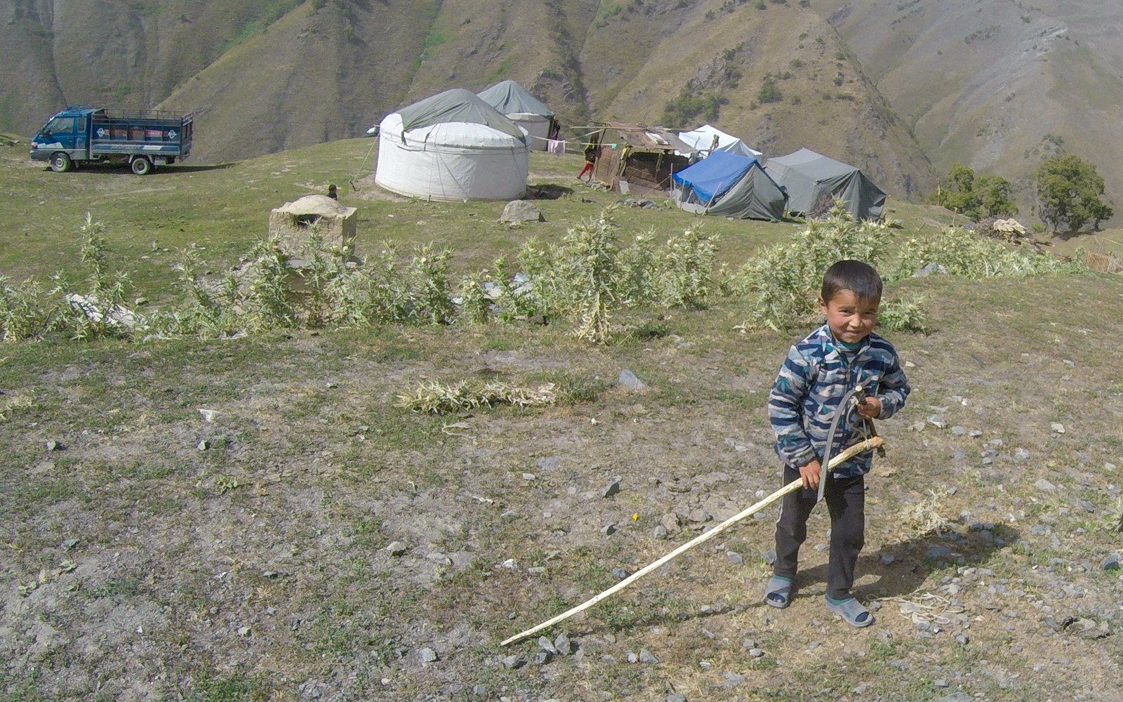 Ανεβαίνοντας προς την κορυφή σε κάποια στιγμή πετυχαίνουμε ντόπιους νομάδες χωρικούς. Με το που άκουσαν τις μηχανές άρχισαν ν ανεβαίνουν απ τις γιούρτες και τα τσαντίρια που είχαν στήσει. Μας είπαν να κατέβουμε να μας φιλοξενήσουν στα σπίτια τους! Τους ευχαριστήσαμε και τους είπαμε πως είχαμε δρόμο προς το Καζαρμαν και την λίμνη Song Kul!